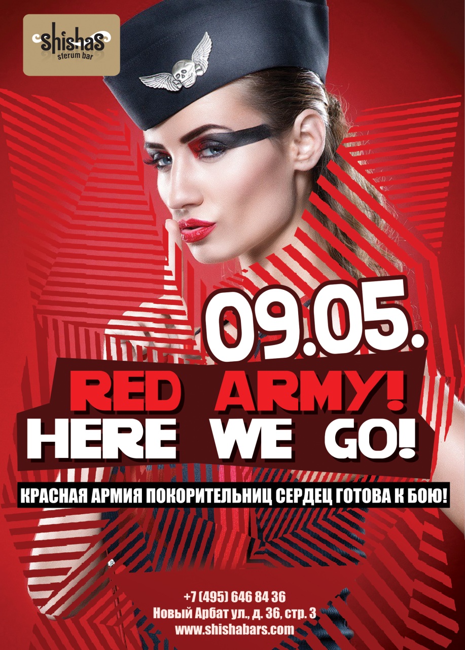 СУББОТА – 9 МАЯ 2015 – RED ARMY! HERE WE GO в Shishas Sferum Bar на Новом Арбате! Красная армия покорительниц сердец готова к бою! Красная помада, красные шпильки, красные ногти – что может быть сексапильнее? Как когда-то пел Богдан Титомир: девушка в красном, как ты прекрасна! :) Сегодня Shishas Sferum Bar на Новом Арбате наполнится сексуальными красотками, которые с легкостью побеждают мужчин одним лишь взглядом! Уверены, что парни будут рады проиграть в этом неравном бою! В день Победы поздравляем всех наших защитников и собираем стройные армейские ряды из особенных красоток! Сделай сам себе настоящий подарок – расслабься и отдайся в плен нашей красной армии! Всю ночь до утра: милитари-стайл, камуфляж на голое тело, грубые ремни на нежной коже с татуировками и манящий взгляд из-под козырька. Заинтригован? Тогда сдавайся без боя! Сегодня спиртное будет литься рекой, закуски и кальяны – сотнями, а доблестные воины женской красной армии уже приготовили свое поражающее 100% оружие. Этой ночью тебе доступно многое – не сиди дома, двигай в Shishas Sferum Bar на Новом Арбате, построение объявлено в 22.00! С праздником, товарищи, с Днем Победы!