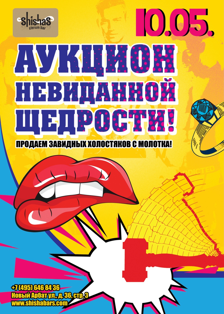ВОСКРЕСЕНЬЕ – 10 МАЯ 2015 – АУКЦИОН НЕВИДАННОЙ ЩЕДРОСТИ в Shishas Sferum Bar на Новом Арбате! Продаем завидных холостяков с молотка! Сегодня ночью Shishas Sferum Bar на Новом Арбате превратитсяв место встречивсех завидных женихов и невест! Девушек ждет удивительный аукцион, где лотами выступят не предметы искусства и роскоши, а самые завидные и не менее роскошные, чем крупные бриллианты – холостяки столицы! :) Штучный товар, который выбран с особой тщательностью и очень скрупулезно – лучшие, сексуальные, богатые и свободные! Признайтесь, что Вы мечтаете именно о таком? Даже если Вы, милые дамы, слегка зазеваетесь за барной стойкой в Shishas Sferum Bar на Новом Арбате и пропустите мимо себя особо ценные экземпляры, будьте спокойны – никто не уйдет обиженный! Масса мужского внимания, комплименты и угощения – все совершенно бесплатно! Запасайтесь терпением и удачи на аукционе! Раз, два, три… продано! :)