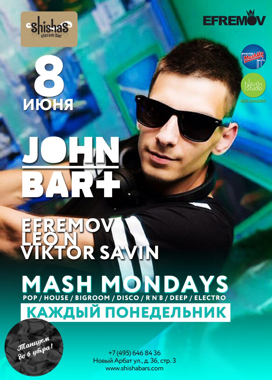 ПОНЕДЕЛЬНИК – 8 ИЮНЯ 2015 – Mash Mondays в Shishas Sferum Bar! Отдыхаем до 6 утра и по ПОНЕДЕЛЬНИКАМ! СТОЛЫ БЕЗ ДЕПОЗИТОВ! SPECIAL GUEST: JOHN BART Все вокруг только и говорят, что о клубном сезоне. А мы не говорим, мы его делаем и запускаем новый проект ПО ПОНЕДЕЛЬНИКАМ – Mash Mondays в Shishas Sferum Bar! Только лучший саунд, самые отборные треки, горячие GO-GO, заводные MC, крутые МЭШАП диджеи и, конечно, наши фирменные СУПЕР-ПУПЕР АКЦИИ на бар, кухню и кальяны!!! ПО ПОНЕДЕЛЬНИКАМ с 23:00 и до 6 утра отдыхаем и танцуем под ритмы: POP, HOUSE, BIGROOM, DISCO, RnB, DEEP и ELECTRO! Mash Mondays – это серия ярких ПОНЕДЕЛЬНИКОВ для тех, кто не успел отдохнуть в выходные или начинает неделю с тусы! Mash Mondays – это отличная возможность попасть на сеты известных МЭШАП диджеев в будний день! Mash Mondays – это ночной град танцевальных стилей и диджей сеты топовых музыкантов и артистов! Mash Mondays – это веселые компании, вкусные кальяны и сумасшедшие акции на баре! Shishas Bar – never sleeps!!! ;) Итак, теперь и в ПОНЕДЕЛЬНИК в Shishas Sferum Bar на Новом Арбате, Вам обеспечена отличная вечерина – Mash Mondays в Shishas Sferum Bar! HAPPY HOURS каждый ПОНЕДЕЛЬНИК: