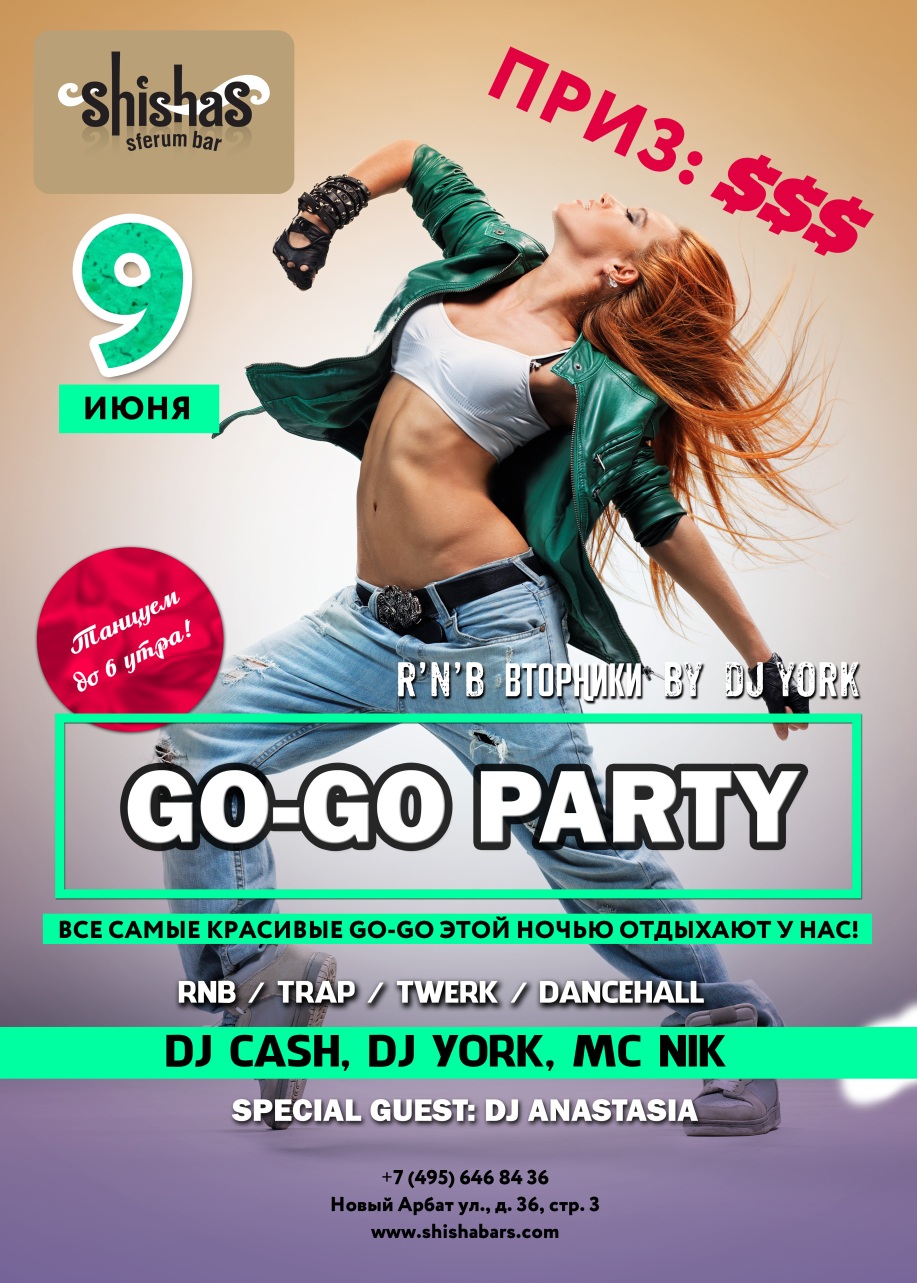 ВТОРНИК – GO GO PARTY в Shishas Sferum Bar! ЛЕГЕНДАРНЫЕ R’N’B ВТОРНИКИ by DJ YORK! SPECIAL GUEST: DJ ANASTASIA Лето – сезон безбашенных вечеринок, которые можно и нужно устраивать каждый вечер и не только по выходным! Пора волнующих романтичных закатов и очень скорых рассветов, которые особенно приятно встречать вместе с друзьями и любимыми под упругие ритмы качественной музыки и с ледяным коктейлем в руке! Не теряя мимолетного осеннего времени, мы запускаем старые добрые ЛЕГЕНДАРНЫЕ R’N’B ВТОРНИКИ by DJ YORK! DJ YORK (Влад Малинин) – абсолютный гуру и стопроцентный лидер множества чартов; персона, о который слышал почти каждый тусовщик! DJ YORK– пожалуй, один из самых востребованных MASH-UP, house и R’N’B диджеев России. Также он не чужд таких стилей, как Funky House, Soulfull & Nu-Disco. В любых музыкальных экспериментах у него найдутся свои фирменные «крючки» – он точно знает, как и чем «зацепить». Красивейшие и необычные треки, мэшапы и ремиксы, созданные с душой и вниманием – все это соединено грамотно и профессионально! Он неизменно не просто стоит за пультом, но показывает интересное шоу, живое выступление на виниле в реальном времени! Итак, отныне по ВТОРНИКАМ в Shishas Sferum Bar на Новом Арбате Вам обеспечена отличная музыка – R’N’B, Trap, Twerk, Dubstep, OldSchool – и неповторимая домашняя атмосфера, которой славятся бары сети Shishas Bar! Не забываем каждый вторник встречаться на танцполе, который будут взрывать наши любимые DJ York, DJ NickyJazz и MC Nik. Невероятные эмоции, позитив в чистом виде и безграничное общение – гарантированы! Танцуем, общаемся с друзьями, радуемся теплу и ловим момент под ритмы R’N’B – ведь лето только начинается! ЛЕГЕНДАРНЫЕ R’N’B ВТОРНИКИ в Shishas Sferum Bar открыты! Стартуем – каждый ВТОРНИК с 23:00 и до 6 утра! HAPPY HOURS каждый ВТОРНИК: